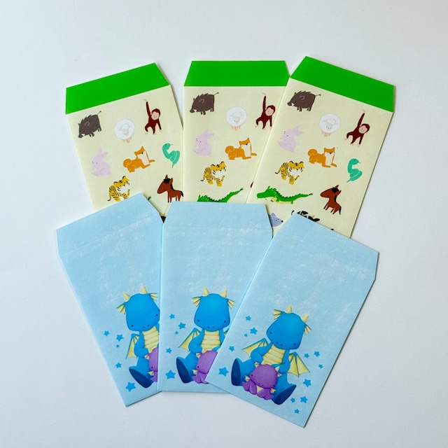 作者念願の!ぽち袋を作りました 12干支とドラゴンの2柄がそれぞれ3枚入ったセットです お年玉だけではなく、小さなお菓子やちょっとしたメモをいれたりと様々なシーンで活躍してくれそうです 仕上がりサイズ 64mm x110mm(うち折り込み部分 15mm)